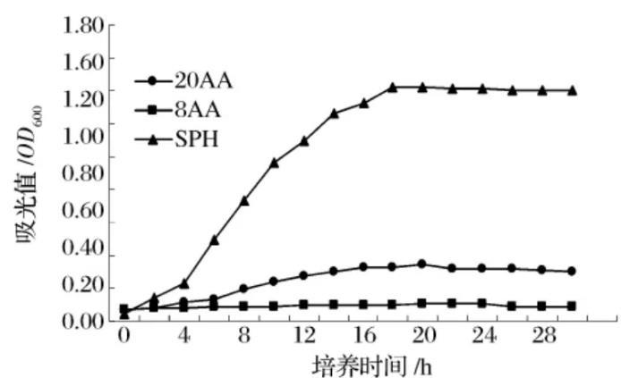 L2在含有SPH培養(yǎng)基上生長狀況如圖3所示,生長量比20種氨基酸有很大改善,可達(dá)到1.425,分別是8種和20種氨基酸培養(yǎng)基的13.4倍和4.1倍。pH值下降到pH 3.94,產(chǎn)酸水平基本可與乳培養(yǎng)基相近。最大生長速率μmax為0.10/h,是20種氨基酸的5倍。