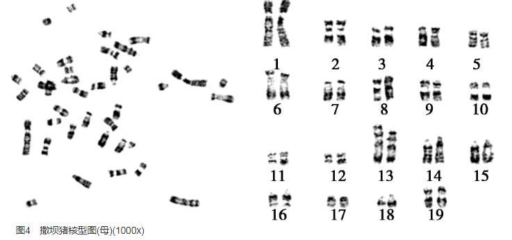 核型制備過程中,固定和滴片是核型分散成功的保證,適當?shù)牡纹叨纫彩侨旧w分散良好的重要條件。撒壩豬成纖維細胞核型制備時,用0.25μg/mL終濃度的秋水仙胺處理細胞2.5 h,低滲40 min,1.5 m滴片,能夠得到分散度好、數(shù)量多的細胞中期染色體。撒壩豬染色體長度的測定計算中,實驗對多個中期染色體分裂相進行了觀察、分析、比對。實驗結(jié)果表明,撒壩豬的染色體2n=38,與其它豬的染色體相似。