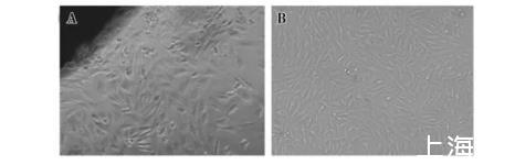 圖1撒壩豬成纖維細胞A:原代細胞(20 X)B:第5代細胞(20X)