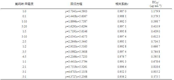 表3氟嗎啉與甲霜靈復(fù)配對(duì)煙草黑脛病菌的聯(lián)合毒力