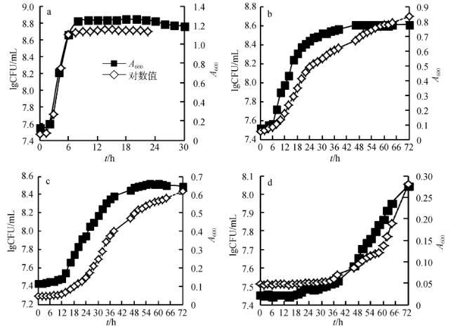 取1.3.1中所述種子液,按5%接種量接種于300 mL無菌LB液體培養(yǎng)基中,充分搖勻后分裝成3份,于28℃下靜置培養(yǎng),每隔2 h取樣,以無菌LB液體培養(yǎng)基作對照,用紫外分光光度計檢測菌液A600值,同時另取菌液進行梯度稀釋,于2216E瓊脂平板涂布計數,統計數據,繪制其在該溫度下的生長曲線。其他溫度(15、10、5℃)梯度條件下實驗方法類同。