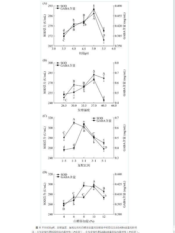 圖8不同初始pH、發(fā)酵溫度、復(fù)配比例和白糖添加量對(duì)發(fā)酵液中SOD活力及GABA含量的影響
