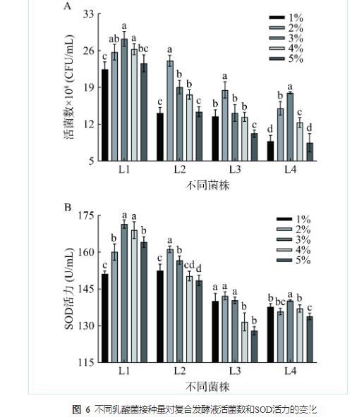 圖6不同乳酸菌接種量對(duì)復(fù)合發(fā)酵液活菌數(shù)和SOD活力的變化