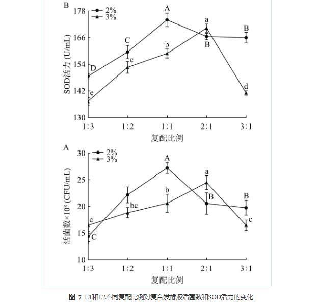 圖7 L1和L2不同復(fù)配比例對(duì)復(fù)合發(fā)酵液活菌數(shù)和SOD活力的變化