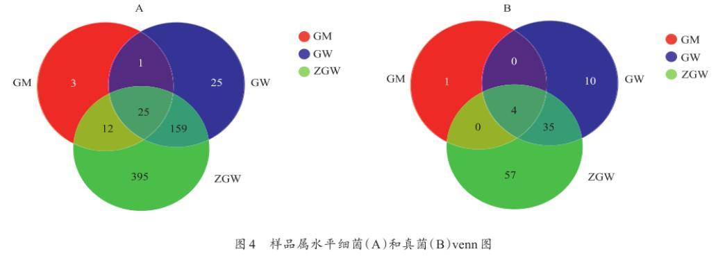 圖4樣品屬水平細菌(A)和真菌(B)venn圖