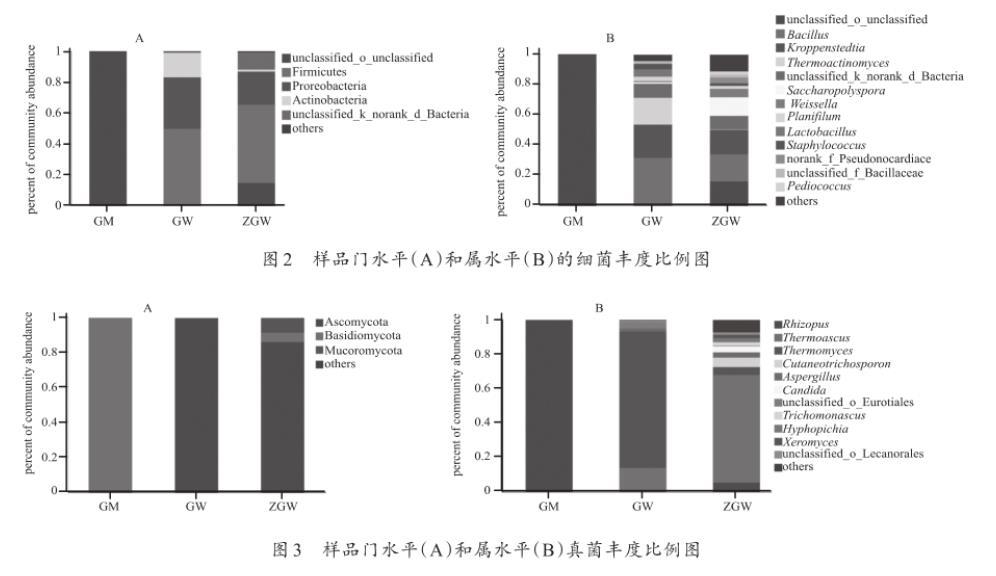 在門水平和屬水平上分別計算了各樣本的細菌群落的物種平均相對豐度(n=3),如圖2所示。(1)高溫大曲(GW)在門水平上的優(yōu)勢菌群(平均相對豐度>1%)包括Firmicutes(厚壁菌門,50.13%),Proreobacteria(變形菌門,33.13%)和Actinobacteria(放線菌門,15.84%);在屬水平上有Bacillus(芽孢桿菌屬,32%),Kroppenstedtia(21.6%),Saccharopolyspora(糖多孢菌屬,18.06%),Thermoactinomyces(高溫放線菌屬,9.01%),Norank_f_Pseudonocardiaceae(4.93%),Planifilum(3.4%),Staphylococcus(葡萄球菌屬,3.13%)和Pediococcus(片球菌屬,1.75%)。(2)中高溫大曲(ZGW)在門水平上的優(yōu)勢菌群有Firmicutes(厚壁菌門,50.76%),Proteobacteria(變形菌門,21.21%)和Actinobacteria(放線菌門,14.81%);在屬水平上有Bacillus(芽孢桿菌屬,17.96%),Kroppenstedtia(16.23%),Thermoactinomyces(高溫放線菌屬,8.73%),Weissella(魏斯氏菌屬,5.48%),Lactobacillus(乳桿菌屬,3.8%),Pediococcus(片球菌屬,2.46%),Planifilum(1.96%)和Staphylococcus(葡萄球菌屬,1.69%)。(3)根霉曲在目水平未分類。