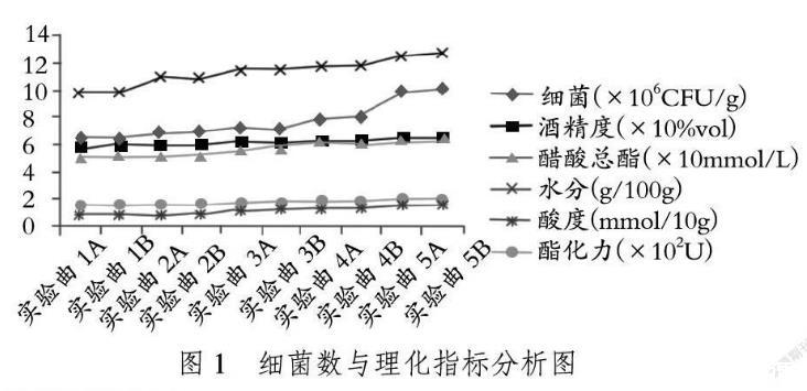 由圖1可知,隨著實驗曲細菌數(shù)量的增加,實驗曲中所含水分的量也要增加。因為,細菌數(shù)量越多,所需的水分便越多。同時,隨著實驗曲細菌數(shù)量的增加,酒曲的理化指標酸度和酯化力、原漿酒的理化指標酸酯總量和酒精度都是隨著實驗曲的細菌數(shù)量的增加而增加的。