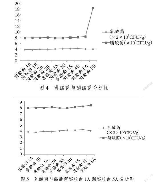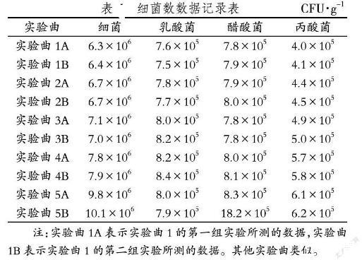 由表可知,實驗曲1、實驗曲2、實驗曲3、實驗曲4和實驗曲5的細菌數(shù)依次遞增,丙酸菌數(shù)也是依次遞增的。實驗曲1、實驗曲2和實驗曲3的乳酸菌數(shù)是依次遞增,實驗曲3、實驗曲4和實驗曲5的乳酸菌數(shù)是依次遞減的。實驗曲1、實驗曲2乳酸菌的數(shù)量相對于實驗曲3、實驗曲4和實驗曲5較少。