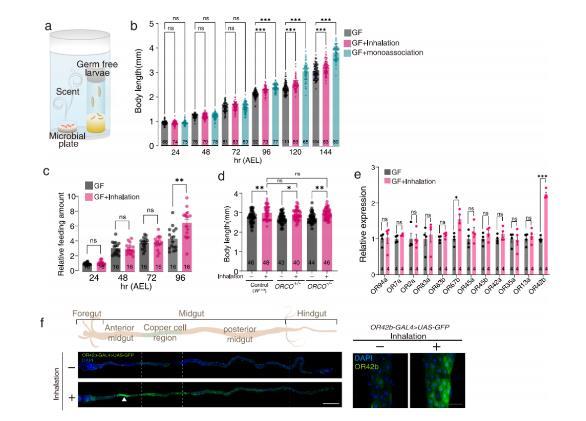 當讓已知的“嗅盲”O(jiān)RCO?/?動物暴露于LPWJL揮發(fā)物時,LPWJL釋放的氣味仍然支持它們的生長。這些結(jié)果表明,由LPWJL釋放的氣味誘導(dǎo)的宿主生長獨立于嗅覺,即不依賴于ORNs的氣味感知。雖然認為ORs的表達僅限于嗅覺器官,但最近的數(shù)據(jù)揭示了ORs在果蠅和哺乳動物的非嗅覺器官中也存在。作者進一步監(jiān)測了在不存在或存在LPWJL揮發(fā)物的情況下這些ORs的表達。結(jié)果顯示,暴露于LPWJL揮發(fā)物后,OR42b顯著上調(diào)。使用攜帶融合到Gal4的OR42b啟動子的果蠅分析腸道中OR42b表達顯示,吸入LPWJL揮發(fā)物后,OR42b主要在前中腸區(qū)域的腸上皮細胞中檢測到。此外,OR42b表達也在前胃和中腸之間的邊界區(qū)域以及位于后中腸區(qū)域的部分腸內(nèi)分泌細胞中檢測到。綜上所述,OR42b不僅在其已知的嗅覺器官中表達,還在非嗅覺細胞中表達。此外,腸道OR42b響應(yīng)于LPWJL釋放的氣味而被誘導(dǎo)表達。