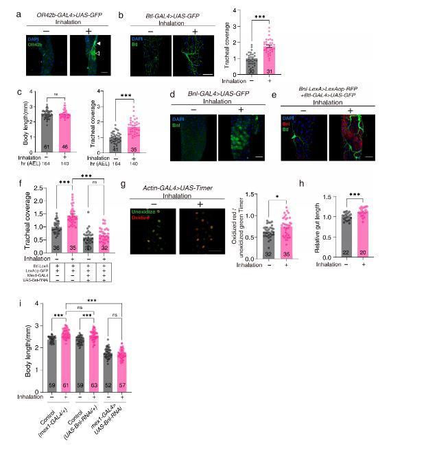 結(jié)果發(fā)現(xiàn),Bnlcopper和Bnlposterior表達是恒定的,而Bnlanterior表達在同一前中腸區(qū)域是可誘導(dǎo)的。雙重標記Bnl和Btl表達證實,暴露于LPWJL揮發(fā)物后,腸上皮細胞中的Bnl表達和氣管細胞中的Btl表達均增強。下調(diào)腸上皮細胞中的Bnl表達減少了基礎(chǔ)和LPWJL誘導(dǎo)的氣管分支形成,表明腸上皮細胞中LPWJL誘導(dǎo)的Bnl對于氣管分支形成是必需的。此外,作者發(fā)現(xiàn)暴露于LPWJL揮發(fā)物后,腸道氧濃度和腸道大小增加。進一步發(fā)現(xiàn),下調(diào)腸上皮細胞中的Bnl表達消除了LPWJL揮發(fā)物的生長促進效應(yīng)。綜上所述,LPWJL揮發(fā)物通過Bnl/Btl信號通路激活呼吸道-腸道軸,調(diào)節(jié)器官中的氧氣供應(yīng),從而促進身體生長。