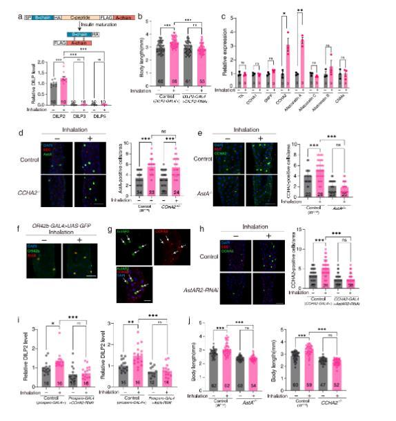 監(jiān)測LPWJL揮發(fā)物改變的腸道激素表達,發(fā)現(xiàn)兩種腸道肽激素allatostatin-A(AstA)和CCHAmide-2(CCHA2)在一部分腸內(nèi)分泌細胞中被LPWJL揮發(fā)物顯著上調(diào)。這些數(shù)據(jù)表明LPWJL揮發(fā)物增加了分泌AstA或CCHA2的EECs比例,并且AstA對于LPWJL揮發(fā)物誘導(dǎo)的CCHA2表達是必需的。重要的是,OR42b特異性地在AstA+EECs中表達,而AstA受體2(AstAR2)與CCHA2共定位,并且AstAR2對于VSF誘導(dǎo)的CCHA2表達是必需的。這些結(jié)果表明,LPWJL揮發(fā)物首先誘導(dǎo)OR42b表達的EECs中AstA的表達,然后AstA通過AstAR2表達的EECs進一步誘導(dǎo)CCHA2的表達。最后,研究發(fā)現(xiàn)LPWJL揮發(fā)物誘導(dǎo)的腸道AstA和CCHA2激素對于腦中IPC分泌DILP2是必需的,從而形成促進全身生長的生長軸。具體來說,敲低腸道AstA或CCHA2消除了LPWJL揮發(fā)物誘導(dǎo)的DILP2分泌,且單個激素的突變足以消除LPWJL揮發(fā)物誘導(dǎo)的身體生長。綜上所述,LPWJL揮發(fā)物誘導(dǎo)的腸道AstA和CCHA2激素對于腦中IPC分泌DILP2是必要的,從而形成腸-腦軸以促進全身生長。