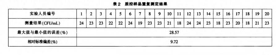 平板間誤差規(guī)定要求≤10%,但在實(shí)際工作中有時(shí)不易達(dá)到。從表2中可以看出,最大值與最小值的誤差為28.57%,大于10%,但20次檢測(cè)結(jié)果均接近于真值,相對(duì)標(biāo)準(zhǔn)偏差為9.72%。周紅雨曾在《泊松分布應(yīng)用于菌落總數(shù)質(zhì)量控制》一文中闡明,當(dāng)時(shí),平行平板a1、a2之間的計(jì)數(shù)結(jié)果較理想。從表2中可知,20組數(shù)據(jù)符合泊松分布,最大值為24 CFU/mL,最小值為18CFU/mL,符合上述公式。因此,在實(shí)際檢測(cè)工作中,當(dāng)菌落總數(shù)測(cè)定值為10~30 CFU/mL時(shí),可以用判定平行平板檢測(cè)結(jié)果的準(zhǔn)確性。