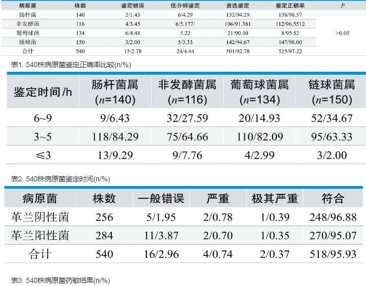 對(duì)比分析鑒定結(jié)果正確率及所需鑒定時(shí)間,分析藥敏結(jié)果符合率。