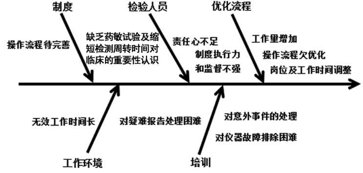 1.2.1多次召開微生物工作人員品質指標會議,對影響藥敏試驗結果報告時間的相關因素進行分析,并利用魚骨圖進行梳理,找出需要進行改進的相關因素,魚骨分析圖見圖1。