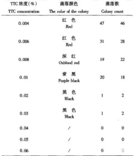 大腸埃希菌在不同TTC濃度試驗(yàn)組中,TTC終濃度為0.002%時,菌落呈紅色,菌落大小與對照組相當(dāng);TTC終濃度≤0.01%時,菌落數(shù)量和對照組基本相當(dāng);TTC終濃度≥0.02%時,菌落呈黑色、點(diǎn)狀,菌落數(shù)量也明顯減少(表1)。