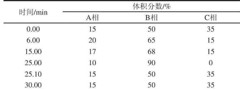 色譜測(cè)定參數(shù):色譜柱:Grace Smart RP-18色譜柱(250 mm×4.6 mm,5μm),柱溫40℃,流速1.0 mL/min,進(jìn)樣量10μL,熒光激發(fā)波長(zhǎng)為350 nm,發(fā)射波長(zhǎng)為520 nm。流動(dòng)相A為0.1 mol/L乙酸銨溶液,流動(dòng)相B為乙腈,流動(dòng)相C為超純水。梯度洗脫程序見(jiàn)表1。