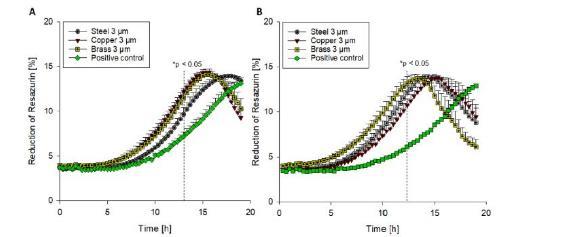 圖5、與結(jié)構(gòu)化(3μm)銅、黃銅和鋼以及未經(jīng)處理的孢子接觸后,孢子生長和發(fā)芽過程中代謝活性的發(fā)育,沒有任何金屬表面接觸。代謝活性測量為A)A.niger野生型N402孢子和B)A.niger色素沉著突變菌株(MA 93.1)與3μm USP-DLIP功能化表面接觸120分鐘后刃天青(%)的相應(yīng)減少。將陽性對照的代謝速率與處理過的孢子進(jìn)行比較,觀察到以下顯著性:A)鋼3μm(p=0.010)、銅3μm(p=0.0007)和黃銅3μm(p=0.0006)。數(shù)據(jù)顯示為平均值±標(biāo)準(zhǔn)誤差(n=3)。值得注意的是,在野生型孢子(p=0.03)的12小時(shí)時(shí)觀察到鋼和銅表面之間的特異性顯著差異,盡管由于隨著時(shí)間的推移重疊的代謝趨勢,這種差異很難可視化。B)鋼3μm(p=0.006),銅3μm(p=0.010)和黃銅3μm(p=0.004)。