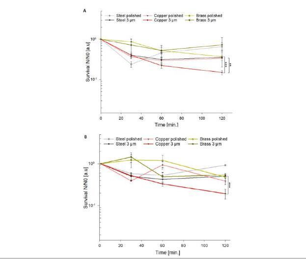 圖4、A)A.niger野生型N402孢子和B)A.niger色素沉著突變菌株(MA 93.1)在與相應(yīng)的功能化表面接觸30、60和120分鐘后的存活數(shù)據(jù)。存活分?jǐn)?shù)(N/N0)是相對于未暴露的孢子計(jì)算的(與金屬表面沒有任何接觸的初始孢子濃度)。
