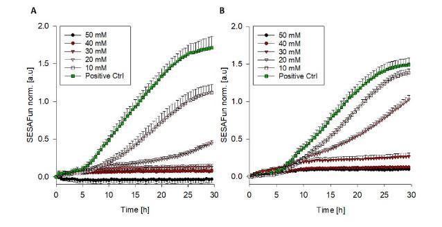 圖3、以SESAfun規(guī)范[a.u].對應(yīng)于A)野生型菌株和B)色素沉著突變菌株隨時(shí)間變化的真菌質(zhì)量。陽性(未處理的)真菌孢子顯示為綠色。