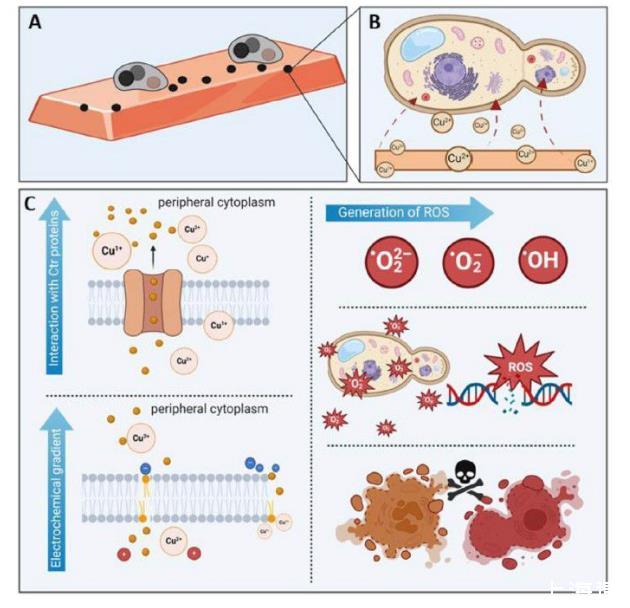 圖1、銅表面對微生物物種抗菌作用的簡化方案,這里是真菌細(xì)胞的示例。A,B)銅離子從銅表面溶解并進(jìn)入微生物(真菌細(xì)胞)壁和膜。通過與嵌入膜中的銅轉(zhuǎn)運(yùn)蛋白的直接相互作用或通過被動(dòng)機(jī)制(如跨膜的電化學(xué)梯度)進(jìn)行主動(dòng)運(yùn)輸,導(dǎo)致膜電位和細(xì)胞質(zhì)內(nèi)容物的損失。銅離子在細(xì)胞內(nèi)的積累必須達(dá)到一定的閾值才會變得有毒,這個(gè)閾值因生物體而異。C)不同的銅種類通過Fenton樣反應(yīng)誘導(dǎo)活性氧(ROS)的產(chǎn)生,基因組和質(zhì)粒DNA降解,最終導(dǎo)致細(xì)胞死亡。