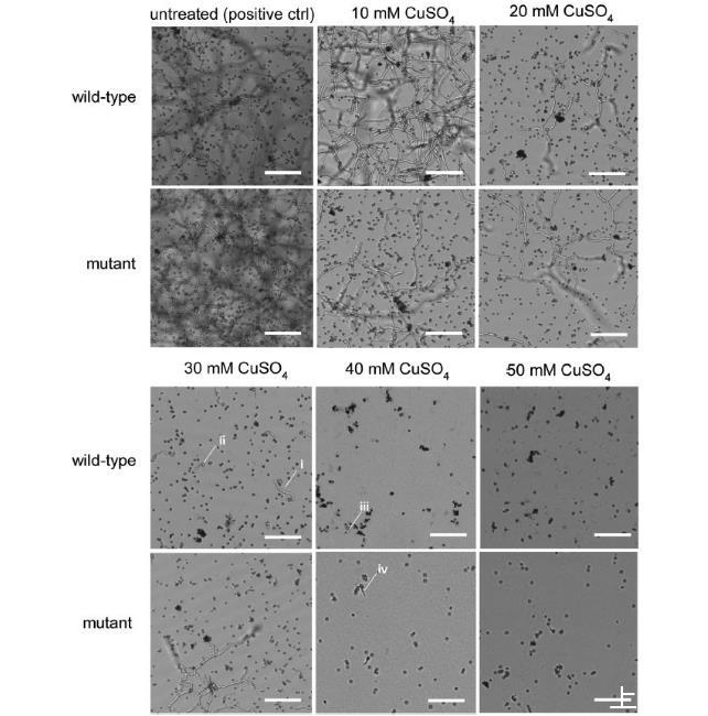 圖2、在30°C(終點(diǎn))下孵育30小時(shí)后,所有測試的CuSO4濃度(10×10、20×10、30×10、40×10、50×10m)以及兩種菌株的未處理對照。比例尺對應(yīng)于50μm