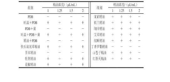 注:25種精油均為精油+吐溫+PDB+皮落青霉;+.有菌絲生長;-.無菌絲生長。下同。