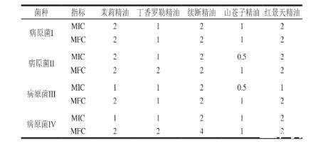表3 5種植物精油對4種致病菌的MIC和MFC