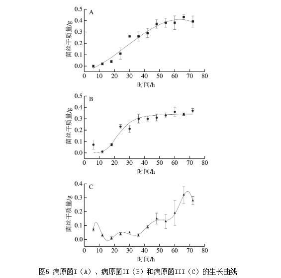圖5病原菌I(A)、病原菌II(B)和病原菌III(C)的生長曲線