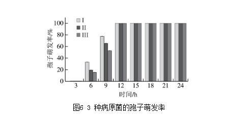 如圖6所示,3種病原菌在培養(yǎng)6 h時均已萌發(fā),其中病原菌I的孢子萌發(fā)率最高(33%),病原菌II次之(19.67%),病原菌III最低(15.59%)。隨著培養(yǎng)時間的延長,3種病原菌的孢子萌發(fā)率持續(xù)增加,且均在12 h完全萌發(fā)。