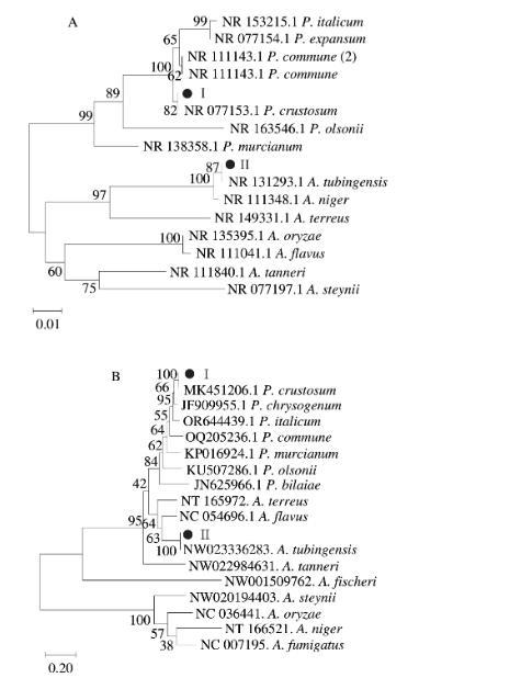 病原菌II菌絲為白色,壁厚且光滑,頂部形成球形頂囊,頂囊上覆蓋一層?;托」?,分生孢子由小梗上產(chǎn)出。分生孢子為黑褐色,呈圓形或近圓形,直徑為4μm左右。在PDA培養(yǎng)基上最先蔓延的是一層微乳白的分泌物,產(chǎn)孢量高,正面質(zhì)地為絨狀,顏色為黑褐色或者棕褐色,背面白色或微黃。侵染藍(lán)莓后藍(lán)莓果肉軟腐,有黑色霉層覆蓋并伴隨汁液流出,根據(jù)其形態(tài)特征與曲霉屬中的黑曲霉相似,推測病原菌II為曲霉屬真菌。