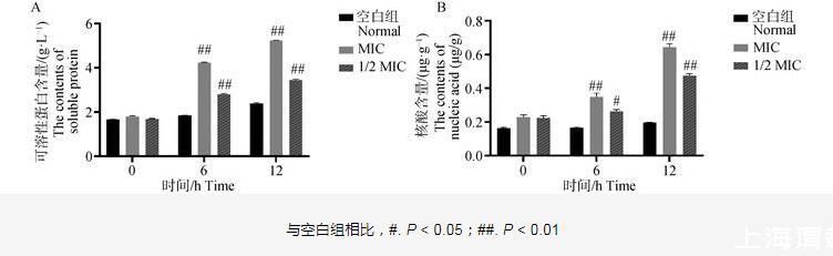 如圖4所示,空白組菌液中的可溶性蛋白含量和核酸含量基本穩(wěn)定在較低水平,無(wú)明顯波動(dòng)。與空白組相比,呼寧散作用6和12 h時(shí),1/2 MIC組和MIC組培養(yǎng)液中的可溶性蛋白含量和核酸含量極顯著增加(P<0.01)。表明呼寧散能夠?qū)﹄u肺源大腸桿菌的細(xì)胞膜造成破壞,導(dǎo)致胞外蛋白濃度升高、核酸外溢。