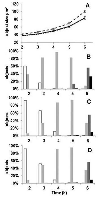 將10?個分生孢子稀釋至5×10?個孢子/毫升的濃度,接種于含有25 mM麥芽糖的轉(zhuǎn)化培養(yǎng)基(TM)中。掃描區(qū)域長度設(shè)置為2205微米,掃描區(qū)域大小設(shè)置為70-700像素,最大物體數(shù)量設(shè)置為1000。從接種后2小時開始掃描,每小時掃描一次,直到微菌落開始覆蓋休眠或萌發(fā)的孢子。oCelloScope能夠?qū)崟r監(jiān)測黑曲霉分生孢子的萌發(fā)過程,包括孢子的膨脹、萌發(fā)和菌絲生長。通過分析孢子的表面積和圓度變化,oCelloScope可以將孢子精確分類為休眠孢子、腫脹孢子、萌發(fā)孢子和菌絲,從而提供詳細(xì)的萌發(fā)動態(tài)數(shù)據(jù)。提供了孢子萌發(fā)的動態(tài)圖像,還生成了詳細(xì)的數(shù)值數(shù)據(jù),包括孢子的表面積、圓度等參數(shù),為研究孢子萌發(fā)機(jī)制提供了豐富的信息。
