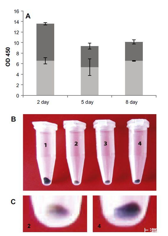 圖2、用鹽水吐溫(深灰色陰影)和NaOH(淺灰色陰影)提取的2日齡、5日齡和8日齡的黑曲霉分生孢子的黑色素量(A)以及2-(管2)、5-(管3)和8日齡(管4)分生孢子的色素沉著用水和NaOH提取后,未提取的2日齡分生孢子作為對照(管1)(B)。(C)顯示了管2和4提取的孢子顆粒的放大倍數(shù)。對比度和亮度也同樣增加。誤差線表示生物重復(fù)的標(biāo)準(zhǔn)差。