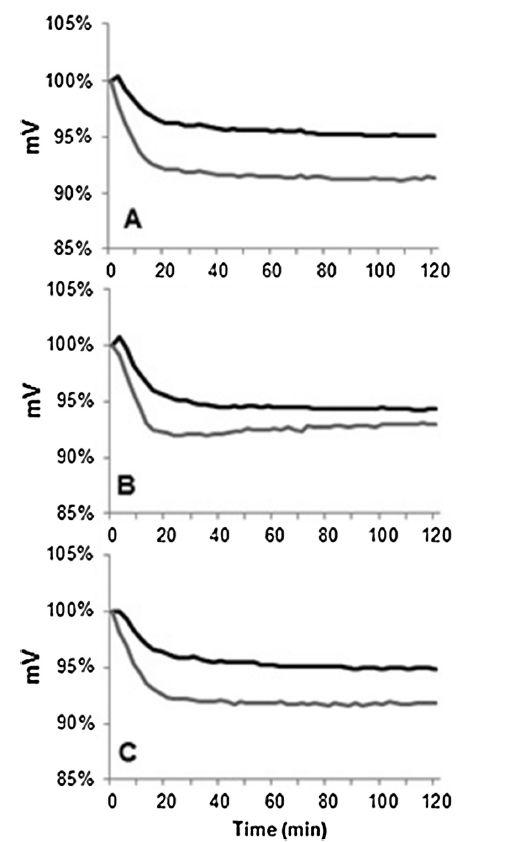 圖4、在2-(A)、5(B)和8-(C)日齡生物重復(fù)分生孢子的情況下,表明代謝活性的CO2水平增加,通過CO2傳感器電壓(mV)的降低進(jìn)行監(jiān)測。