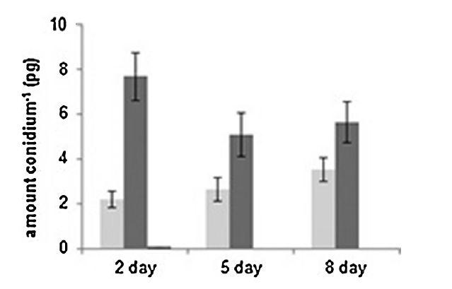 圖1、黑曲霉2日齡、5日齡和8日齡分生孢子中海藻糖(淺灰色陰影)、甘露醇(深灰色陰影)和甘油(黑色陰影)的量(pg分生孢子)。誤差線表示技術(shù)和生物學(xué)重復(fù)的標(biāo)準(zhǔn)差