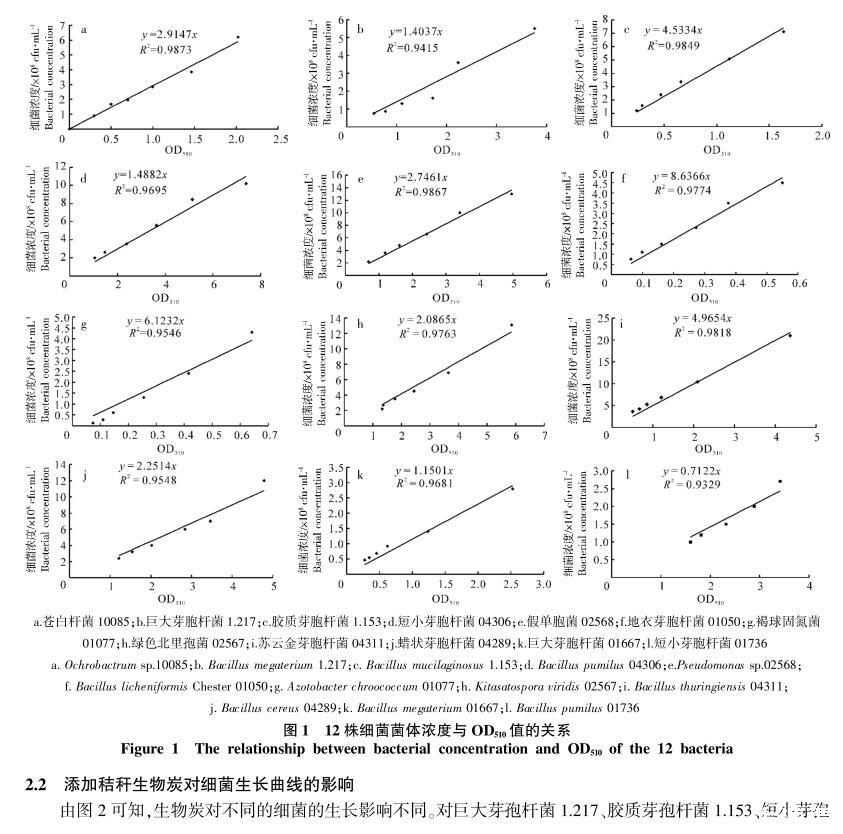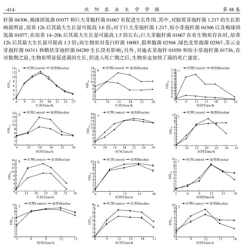 結(jié)果表明,秸稈生物炭對不同的細菌的生長影響不同,對于部分細菌存在明顯生長促進作用,其中對膠質(zhì)芽孢桿菌1.217的促進作用最明顯,培養(yǎng)12h后其最大生長量可提高3.6倍;對于巨大芽孢桿菌1.217、短小芽孢桿菌04306以及褐球固氮菌01077,加入生物炭培養(yǎng)14~20h后最大生長量可提高1.5倍左右;巨大芽胞桿菌01667加入生物炭培養(yǎng)12h后,其最大生長量也可提高1.3倍;而對于另外一部分細菌,生物炭對其生長基本沒有影響或有較小的抑制作用。
