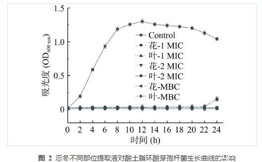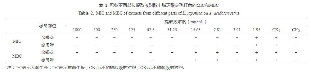 表2忍冬不同部位提取液對酸土脂環(huán)酸芽孢桿菌的MIC和MBC