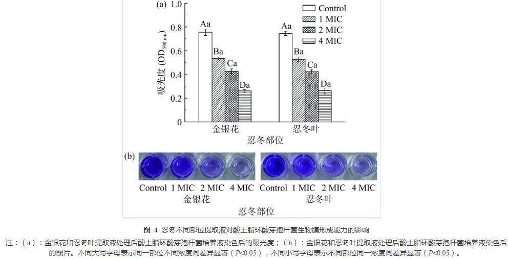 圖4忍冬不同部位提取液對酸土脂環(huán)酸芽孢桿菌生物膜形成能力的影響