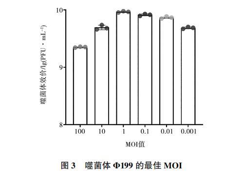 如圖3所示,噬菌體Φ199的效價(jià)在MOI為0.01~100時(shí)均能夠達(dá)到10^8 PFU/mL,并且在MOI為1時(shí),噬菌體的滴度最高為9.24×10^8 PFU/mL,因此噬菌體Φ199與宿主菌O157:H7的最佳MOI為1。