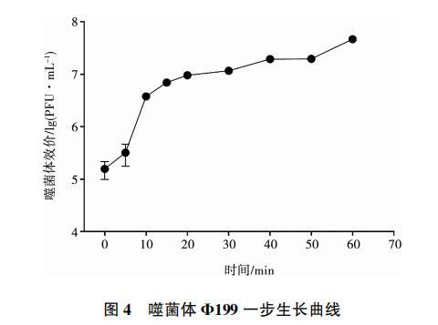 如圖4示,噬菌體Φ199在前5 min內(nèi)效價(jià)無(wú)明顯變化,5~10 min內(nèi)效價(jià)急劇升高,然后趨于穩(wěn)定。裂解量=裂解期平均噬菌斑數(shù)/潛伏期平均噬菌斑數(shù)。噬菌體Φ199的潛伏期為5 min,裂解期為5 min,裂解量為44。