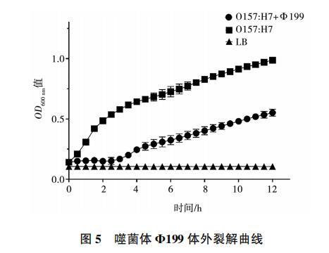 將噬菌體Φ199與宿主菌以最佳MOI混合培養(yǎng)并持續(xù)觀察12 h,結(jié)果如圖5所示。在前3 h內(nèi),噬菌體Φ199能夠完全抑制大腸桿菌O157:H7的生長(zhǎng),未加噬菌體的大腸桿菌O157:H7則保持持續(xù)增長(zhǎng),空白對(duì)照組則未見(jiàn)細(xì)菌增長(zhǎng)。