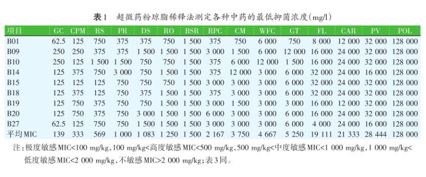 表1超微藥粉瓊脂稀釋法測定各種中藥的最低抑菌濃度(mg/l)