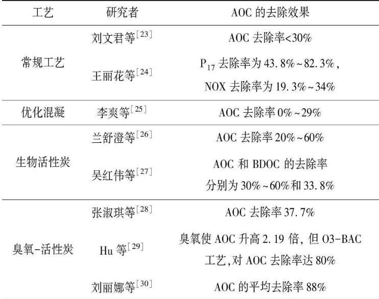 不同的水處理工藝去除AOC的效果也顯著不同,這將影響到采用臭氧消毒時(shí)的飲用水生物穩(wěn)定性。從表2可知,常規(guī)處理工藝和優(yōu)化混凝工藝對(duì)AOC有一定去除能力,但效果不穩(wěn)定?;钚蕴渴欠菢O性或弱極性的吸附材料,能有效地去除水中有機(jī)物,并且臭氧-活性炭工藝能夠?qū)OC達(dá)到很好的去除效果,可獲得生物穩(wěn)定的出廠水。