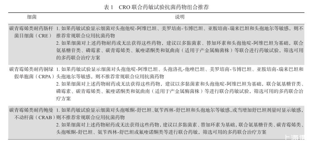 專家共識六:對于不同CRO菌株聯(lián)合藥敏試驗抗菌藥物的選擇,應參考臨床抗感染治療指南或專家共識確定,具體參考表1[22-30]。