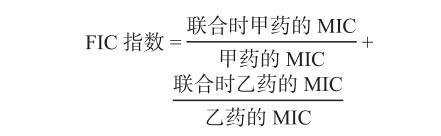 常用部分抑菌濃度指數(shù)(fractional inhibitory concentration index,F(xiàn)IC)為判斷依據(jù)[18-19],即①FIC≤0.5:協(xié)同作用,提示兩種藥物聯(lián)合后的抗菌活性顯著大于各單藥;②FIC>0.5~1:相加作用,提示兩種藥物聯(lián)合后的抗菌活性較各單藥稍有增加;③FIC>1~2:無關作用,提示兩種抗菌藥物的活性均不受另一種藥物的影響;④FIC>2:拮抗作用,提示一種抗菌藥物的活性被另一種抗菌藥物削弱。