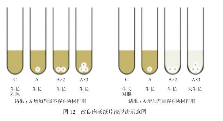 ①常規(guī)肉湯紙片洗脫法:此方法為兩種不同抗菌藥物的聯(lián)合。實驗時在4根無菌試管中分別加入2 mL的CAMHB肉湯,分別標(biāo)記為C、A、B和A+B管,其中C管為生長對照,A管放入1張抗菌藥物A藥敏紙片,B管放入1張抗菌藥物B藥敏紙片,A+B管同時放入抗菌藥物A和抗菌藥物B藥敏紙片,輕輕渦旋30 s,室溫(23±2)℃孵育至少30 min使紙片中的抗菌藥物完全擴(kuò)散入肉湯中(不可超過60 min)(參考CLSI黏菌素肉湯紙片洗脫試驗)[35]。然后準(zhǔn)備0.5麥?zhǔn)蠞岫却郎y菌菌懸液,用移液器分別在在C、A、B和A+B管中加入10μL的0.5麥?zhǔn)蠞岫却郎y菌菌懸液,最終接種菌量為7.5×105CFU/mL,35℃孵育16~20 h后觀察各管中的細(xì)菌生長情況(圖11)。注意:本方法每試管中肉湯的體積需按每片藥敏紙片中所含抗菌藥物的量和該菌對該抗菌藥物的耐藥判斷標(biāo)準(zhǔn)而定,溶液中抗菌藥物最終濃度應(yīng)≥中介標(biāo)準(zhǔn)。如該菌對抗菌藥物的耐藥標(biāo)準(zhǔn)為≥16 mg/L,藥敏紙片中所含抗菌藥物的量為30μg/片,則每管中CAMHB肉湯的含量應(yīng)為2 mL。以紙片中抗菌藥物完全溶解入肉湯中計算,2 mL肉湯中該抗菌藥物的濃度為15 mg/L(近似于耐藥標(biāo)準(zhǔn))。