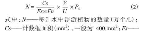 式中:N——每升水中浮游植物的數(shù)量(萬(wàn)個(gè)/L);Cs——計(jì)數(shù)框面積(mm2),一般為400,mm2;Fs——每個(gè)視野的面積(mm2);Fn——每片計(jì)數(shù)過后視野數(shù);Pn——每片通過計(jì)數(shù)實(shí)際數(shù)出的藻類個(gè)體數(shù)或細(xì)胞數(shù);V——1,L水濃縮后的體積;U——計(jì)數(shù)框的體積,0.1,mL。
