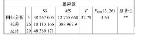 根據(jù)F檢驗(yàn)的公式分別計(jì)算30組數(shù)據(jù)的各差異源的自由度、平方和以及均方,總結(jié)結(jié)果如表2所示。