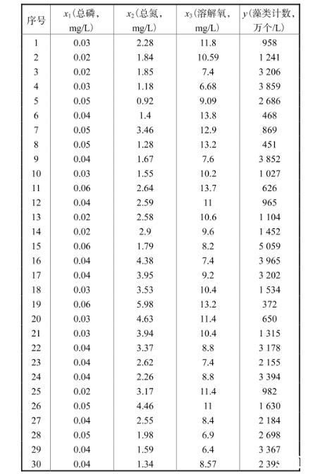 本文選取爾王莊水庫(kù)2013—2015年30組總磷、總氮、溶解氧和藻類計(jì)數(shù)的監(jiān)測(cè)數(shù)據(jù)。這些數(shù)據(jù)基本反映了水體的水質(zhì)情況,匯總結(jié)果如表1所示。假設(shè)4者之間存在線性關(guān)系且關(guān)系式為y=a+b1,x1+b2,x2+b3x3+b4x4,根據(jù)檢測(cè)結(jié)果匯總,通過多元線性回歸分析可得線性回歸方程: