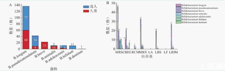 注:A為不同年齡段樣本雙歧桿菌分離鑒定結(jié)果;B為不同培養(yǎng)基雙歧桿菌分離情況。